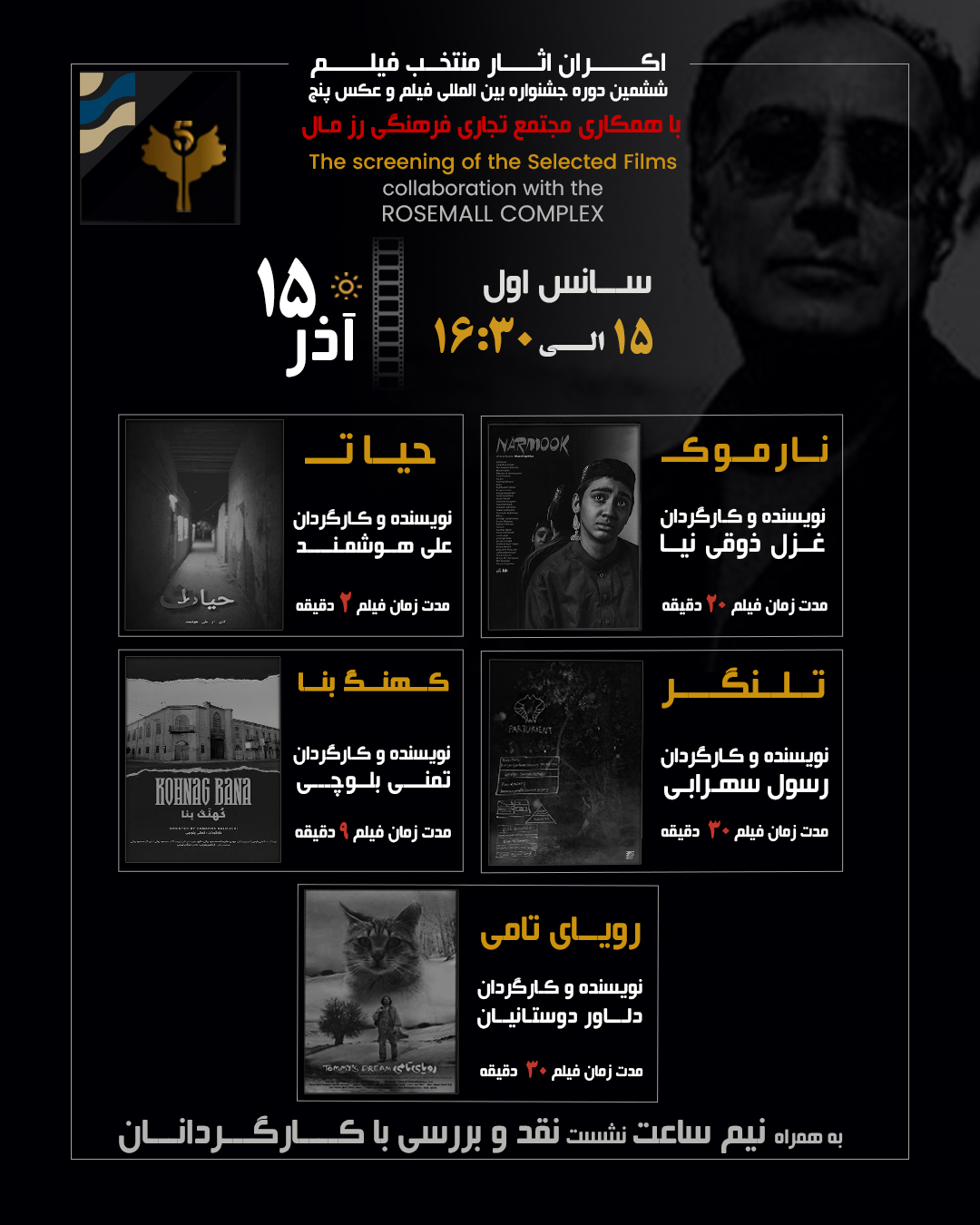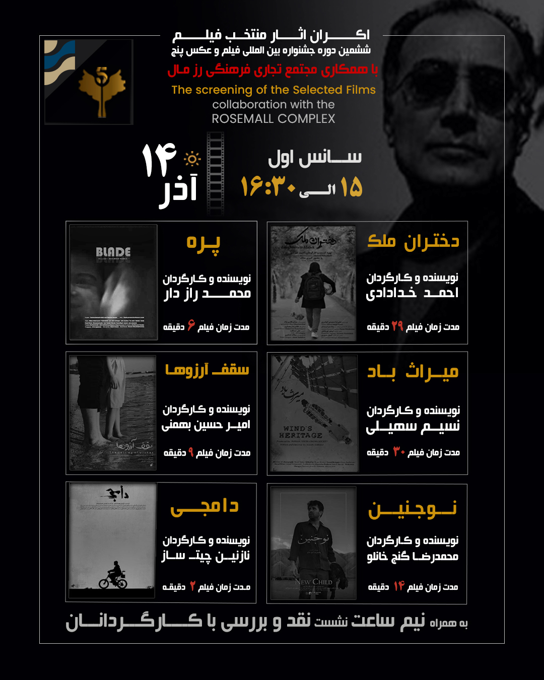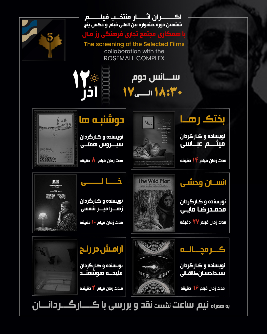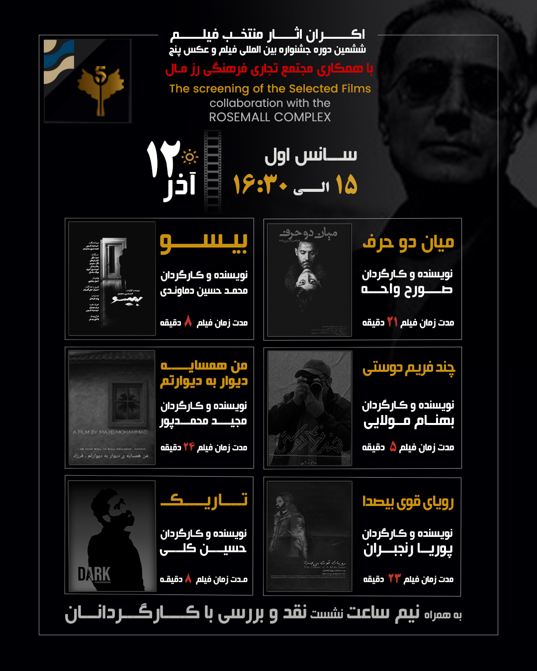 The 6th International 5 Film and Photo Festival – Abbas Kiarostami will be held from December 5 to December 9 2025 at the Rozmall Cinema Complex, in collaboration with the RozmallCultural, Commercial, and Sports Center.